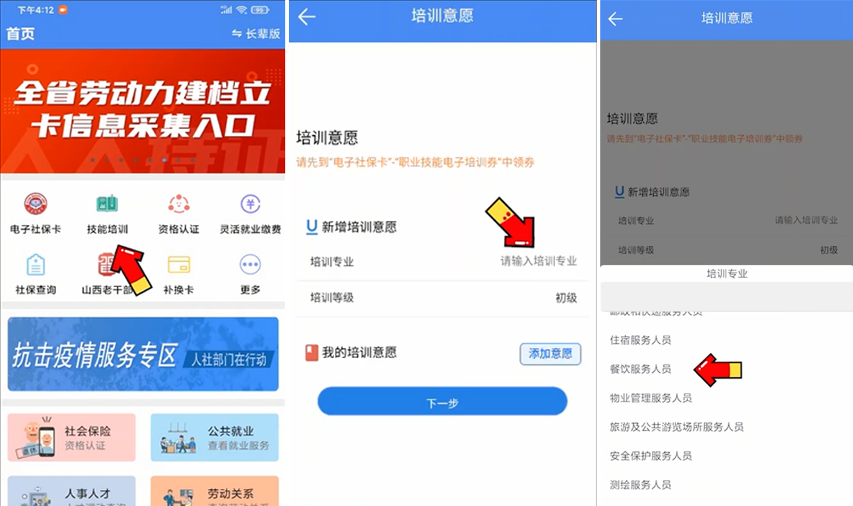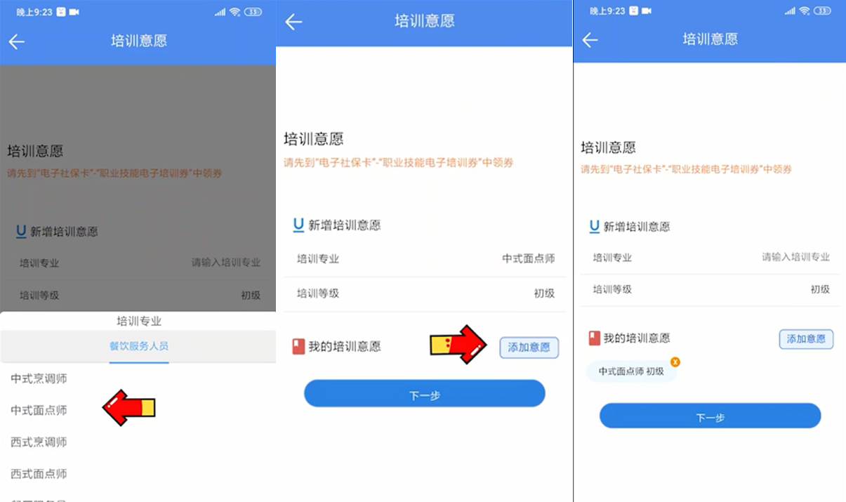 在“电子社保卡”页面,点击“职业培训”,选择培训意愿,如需培训“中式面点师”,先选择“餐饮服务人员”,再选择“中式面点师”,再选择职业等级,如“初级”,并点击确认。